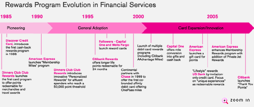 The financial services industry has also aggressively grown a variety of loyalty programs. In 1985, the Diners Club Rewards Program launched as the first credit card program. Five years later, American Express created one of the most successful and popular loyalty programs for the business traveler – ‘Membership Rewards' – without direct access to airline capacity. Their success motivated others such as Capital One and Citibank to follow. Some of these programs even began to leverage evolving technology. Ernex, a subsidiary of the Royal Bank of Canada, operates a credit card loyalty program in tandem with a real-time loyalty points program. Built around a central database that tracks member spending in real-time, the responsiveness for a so-called point of sale program is unmatched, providing coupons, messages or prizes immediately in the form of a printed receipt. These new trends increase the complexity and ultimately the cost of loyalty programs.